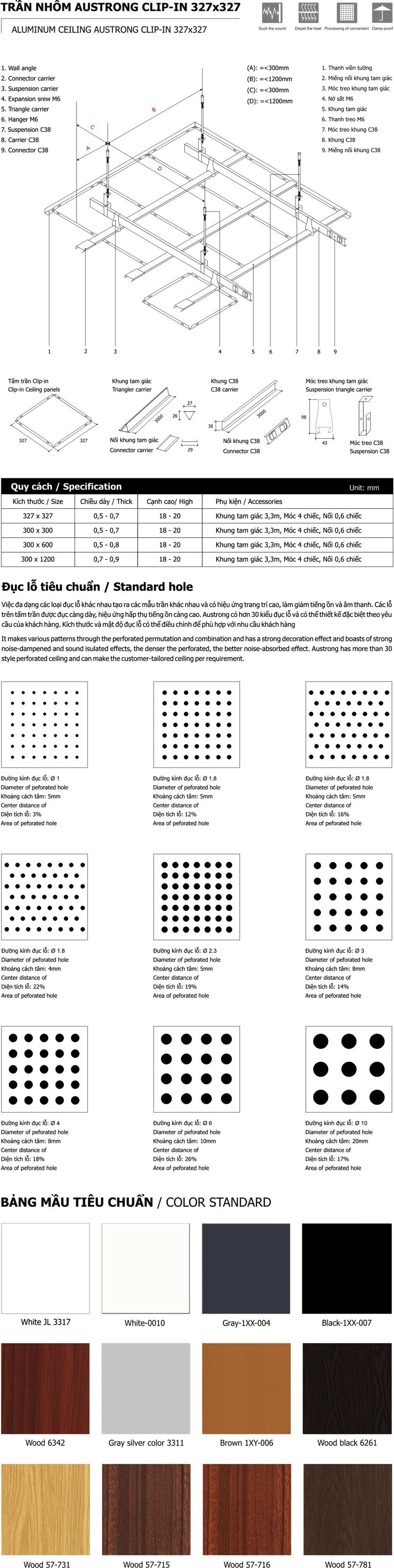 Sử dụng hệ thống treo ẩn kín, trần vuông Clip-in Austrong cho cảm quan về mảng trần gọn gàng và nguyên khối. Hệ trần sử dụng thiết bị kẹp để giữ hai gờ đối diện của tấm vào thanh treo, đảm bảo các tấm trần thẳng hàng và cân bằng. Với các ứng dụng kiến trúc mỹ thuật