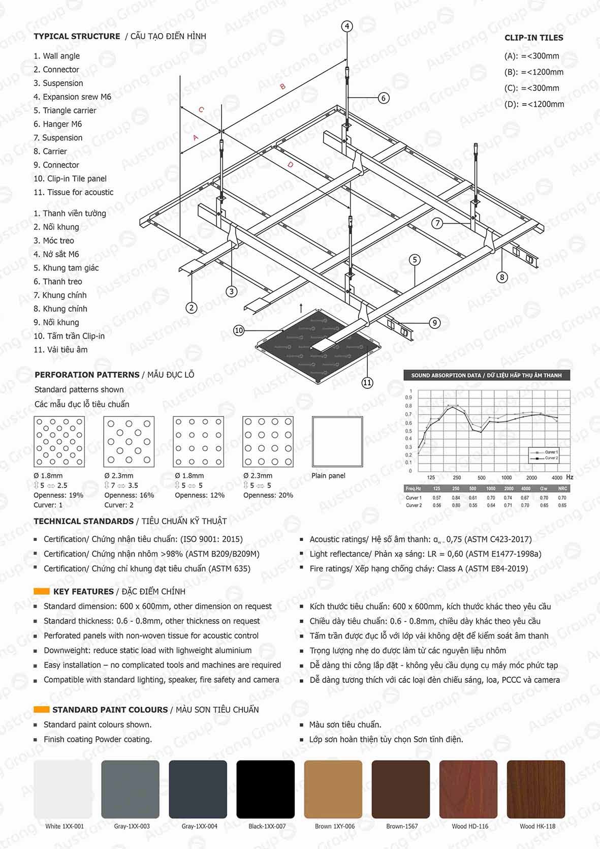 Sử dụng hệ thống treo ẩn kín, trần vuông Austrong Clip-in cho cảm quan về mảng trần gọn gàng và nguyên khối. Hệ trần sử dụng thiết bị kẹp để giữ hai gờ đối diện của tấm vào thanh treo, đảm bảo các tấm trần thẳng hàng và cân bằng. Với các ứng dụng kiến trúc mỹ thuật dùng cho nội và ngoại thất, nhiều kiểu trần vuông và hình chữ nhật bằng nhôm hoặc mạ kẽm có màu sắc phong phú, được đề xuất sử dụng. Nhờ việc dán vải không dệt vào bề mặt bên trong các tấm trần, trần nhôm Clip-in Austrong là hệ trần cách âm, tiêu âm hiệu quả.
